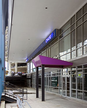 | (Right) Area of Teleview Teller on November 28, 2011, no longer accessible to vehicles. One Teleview Teller was approximately where the concrete stairs are at left. Another was just ahead on the left. The upper floor of the building at right was a Chase bank branch from 2006 to 2014 and the southeast corner was an enclosed area for ATMs. The lower portion was a Crunch fitness center from 1999 to 2008. By 2013, the area was the outdoor dining area of Tortoise Supper Club. | ![]() |