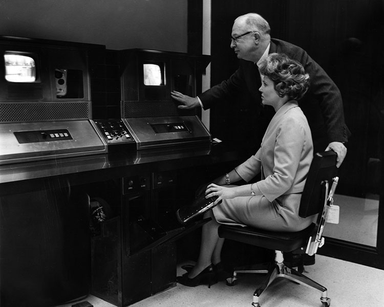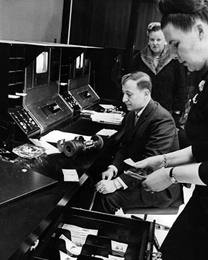 A teller at right, Jeanne Marie Leenaerts, counts change as Mrs. Noonan waits in the background and Mr. Frankel sits at a console filled with television monitors, buttons, switches, papers, keys, and an ashtray. |
