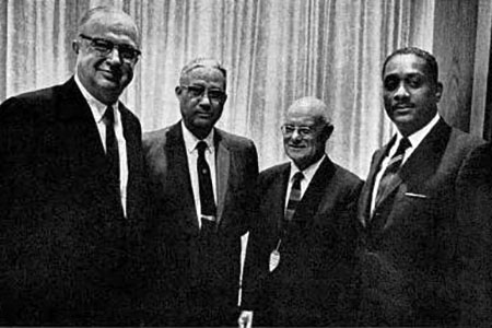 (Left) Four members of the Marina City Bank board of directors, seen here in the November 1964 issue of Ebony magazine. Left to right: Bank president William Fuller Gregson; Theodore K. Lawless; Jacob M. Arvey, chair of the bank; and John H. Johnson, a bank director and publisher of Ebony. |