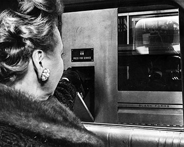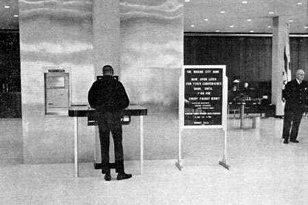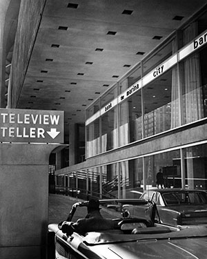 Drive-in and walk-up windows were available outside the bank. Papers and money were sent back and forth through pneumatic tubes. You could see the teller on closed-circuit television. This “Teleview Teller” was also near the apartment towers for use by Marina City residents.