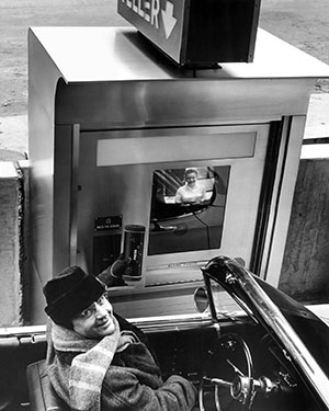 WBBM-TV meteorologist P.J. Hoff uses a Teleview Teller from a convertible outside Marina City Bank in February 1964, one week before the bank officially opens. |