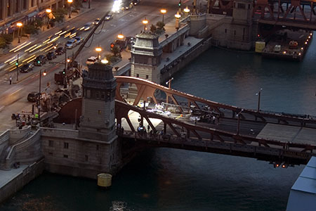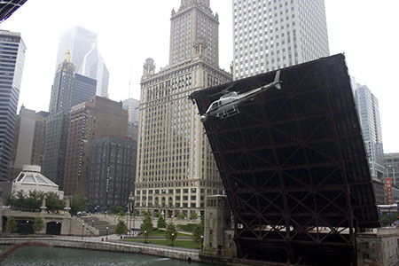 (Left) This stunt was performed on Saturday, August 21, 2010. A helicopter flew low through the raised bridges at Michigan Avenue, Wabash Avenue, and State Street, and is seen here going back for another take. The bridges were raised simultaneously shortly after 9:00 a.m. |