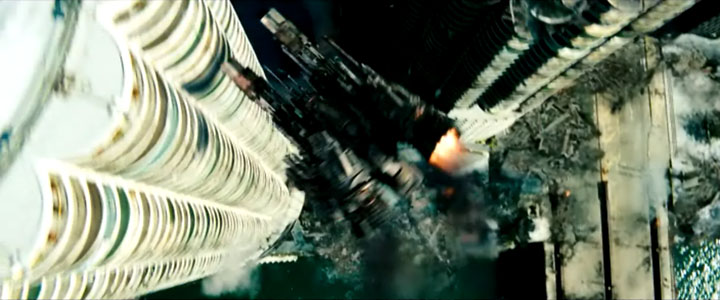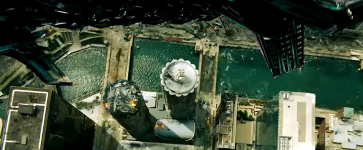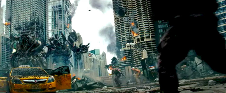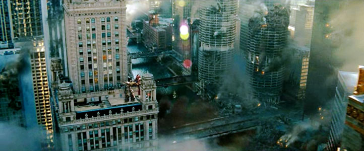 | 10. Transformers on the roof of 35 East Wacker Drive, seen here from the east. Across the river at Marina City, the plaza is completely destroyed. Smith & Wollensky appears to be, well, no longer taking reservations. The commercial platform above the marina is gone except for – and here is your silver lining – Dick’s Last Resort. Several...things...have crashed into the towers and small fires burn throughout the complex. Paramount Pictures/Di Bonaventura Pictures. |