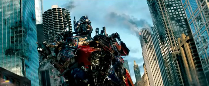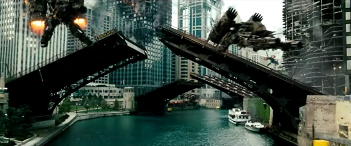 | 3. At the film’s climax, a wounded Optimus Prime stands on the LaSalle Street Bridge with Marina City behind him at left. Other buildings smolder along Wacker Drive at right. |