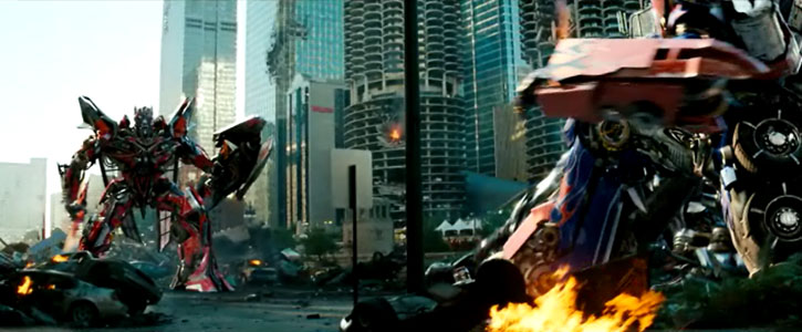 | 8. Sentinel Prime (left) and another Transformer fight on Wacker Drive with Marina City in the background. |