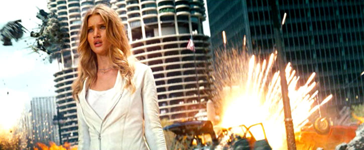 | 2. Whatever has Rosie Huntington-Whiteley’s attention, it is distracting her from the alien robot crashing into the west tower behind her on the left and the truck blowing up on the right. |