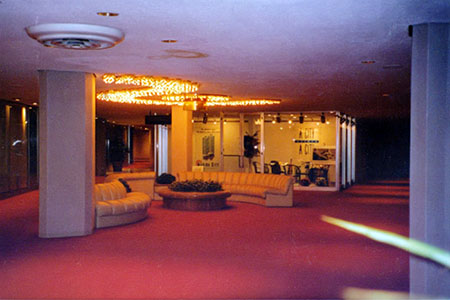 (Left) Sofas on Marina City’s concourse level, circa 1977, photographed by Betty Hogeorges. |