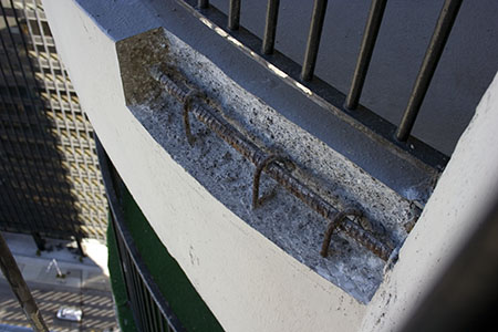 (Right) Rebar is exposed after concrete is cut away on an east tower balcony. |