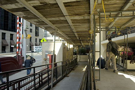(Left) Sidewalk canopy barricades protect pedestrians on Dearborn Street from any falling debris. |