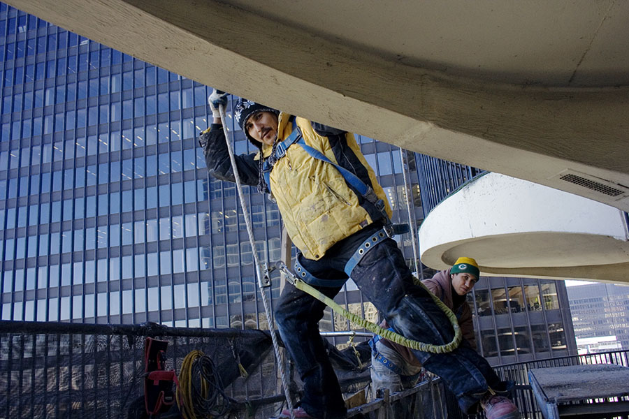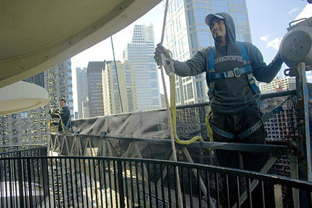 Suspended just beyond the 29th floor of the west tower, brothers Cruz and Hernando Gonzales work from a “swing stage” scaffold suspended approximately 260 feet above Dearborn Street.