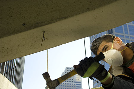 | (Right) A hairline crack is being enlarged so that it can be adequately repaired. Workers will also drill into weakened concrete, down to the rebar. The steel bars that reinforce the concrete will then be sandblasted, sealed with epoxy, and covered with specialized adhesive-added concrete. | ![]() |