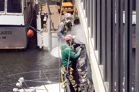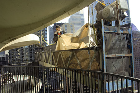 Repair of the massive concrete exterior of both towers began during the week of September 20, 2009, starting with the west tower. With sidewalk canopy barricades protecting pedestrians on Dearborn Street from any falling debris, workers moved up and down the towers from four “swing stage” suspension scaffolds.