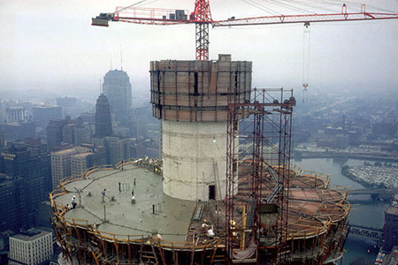 (Left) Marina City’s concrete when it was new, during construction of the west tower in 1962, photographed by Portland Cement Association. |