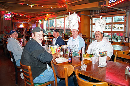 (Left) In town for computer training, five men from northeast Iowa waited 45 minutes to be the very first customers at Dick’s Last Resort at Marina City on October 30, 2008. Left to right: Roger “Hadji” Haugen of Fredericksburg, Iowa, Chad Ott of Readlyn, Chuck Sipple of Waverly, Erwin Mills of Waterloo, and Phil Moser of Waverly. |