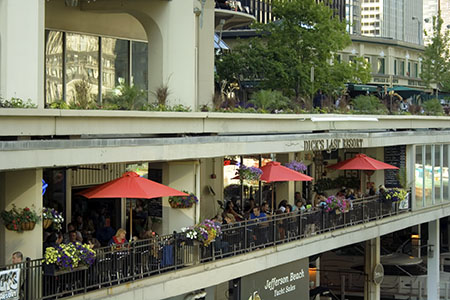 (Left) A stretch of the south curtain wall recessed to create an outdoor dining area at Dick’s Last Resort. Photographed on July 16, 2008. |