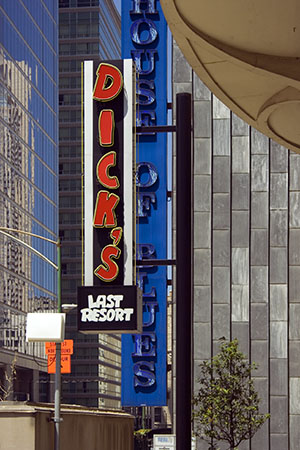 “The architectural community in Chicago will be shocked and greatly disappointed,” predicted Gantt, “by the alterations to Bertrand Goldberg’s original design along Dearborn Street [and] the riverfront, and the tall phallic sign.” (Left) Dick’s Last Resort sign in front of a House of Blues sign on Dearborn Street on July 5, 2009. |