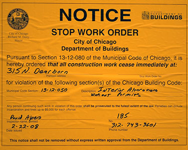 By February 2008, the tenant space had been cleared in preparation for construction but there was no actual permit for interior alterations. Unfortunately for Dick’s, a City of Chicago Department of Buildings inspector, likely acting on a tip, happened by as a general contractor was doing demolition work and coring through concrete to put plumbing. This resulted in a Stop Work Order that was posted on February 22.