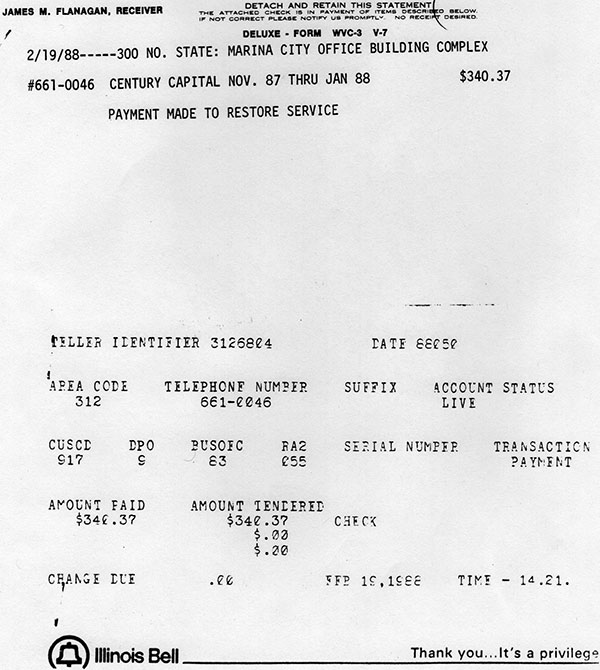 (Left) A statement from Illinois Bell, dated February 19, 1988, showing a payment of $340.37 has been made by Century Capital Corporation to restore telephone service to the Marina City office building (where Hotel Chicago is located today). Century Capital Corporation was based in Houston and its CEO was E. Trine Starnes, Jr., owner at the time of Marina City’s commercial property. |