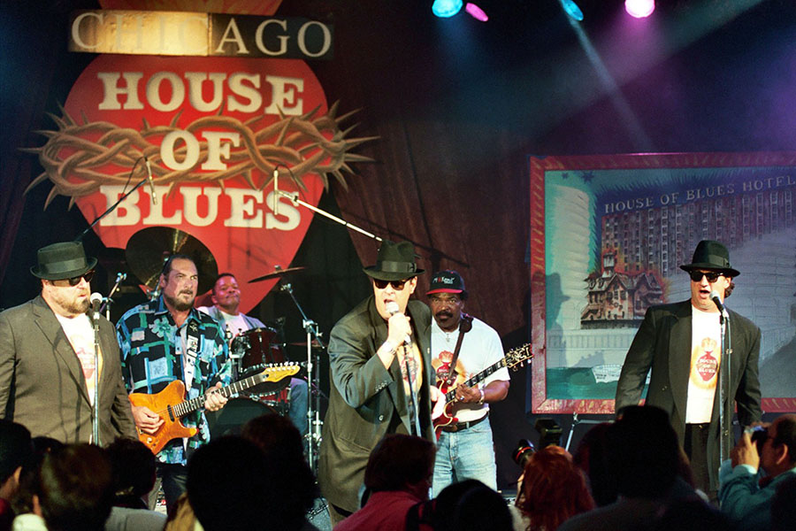 Tigrett and Aykroyd arrived at the September 14 groundbreaking ceremony of the future House of Blues Chicago location in a vintage railroad car, on tracks located below the plaza that led from Union Station to a loading dock at Marina City. With him were more actors and HOB investors – Jim Belushi, the brother of John Belushi, who performed with Aykroyd as the Blues Brothers, and John Goodman. They wore black suits, black hats, and black sunglasses.