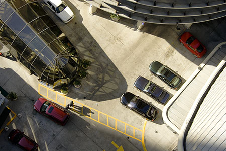 (Left) Aerial view of Marina City plaza from between the towers on November 4, 2007. An entrance to the lower levels is at left. The west tower is at the top and the theater building is at right. |