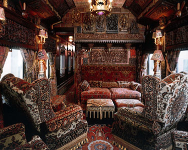 (Right) Interior of Isaac Tigrett’s private railroad car, from Tigrett’s website. |