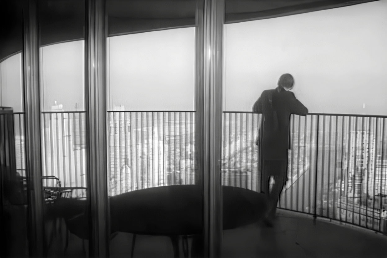(Left) In a scene from Goldstein, Jack Burns waits on the east-facing balcony of an apartment in the east tower. |