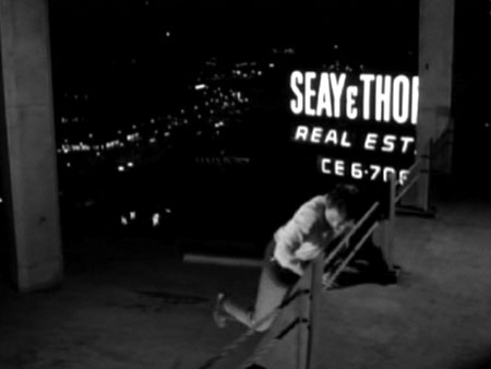 Warren Beatty, climbing in the west tower parking ramp, in a scene from Mickey One. In the distance there is a large billboard for Seay & Thomas Inc., a Chicago real estate firm. |