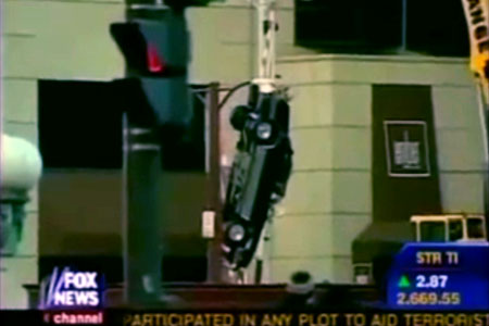 A pressurized air cannon propelled a black 1987 Oldsmobile Cutlass off the 17th floor of the parking ramp. It executed a graceful somersault and plunged into the Chicago River, where Chicago Police tugboats helped retrieve it. The car was then hooked onto a cable and lifted by crane onto Dearborn Street.