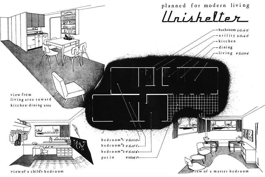 It did, however, inspire Unishelter, a Unicel with bedrooms, bathrooms, kitchen, windows, and doors that Goldberg thought of as “a large brick that could be arranged in different configurations to serve different purposes.”