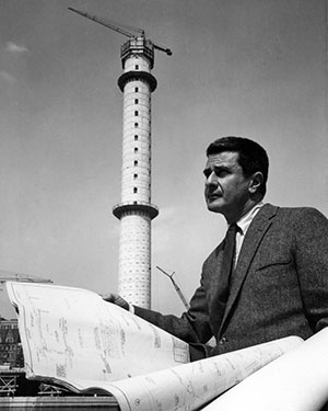(Right) Bertrand Goldberg in front of the east tower core in 1961. Photo by Portland Cement Association. |