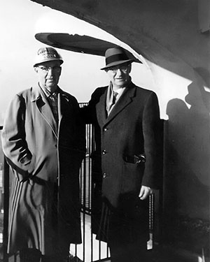 Goodstein described his job as “part public relations man, part umpire, and part businessman.” (Left) William Goodstein (right in photo) in November 1962 with an unidentified man on the balcony of a Marina City apartment. On the man’s hard hat is printed “MARINA CITY” and “B.G.A.,” the initials of Bertrand Goldberg Associates. |