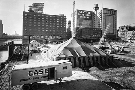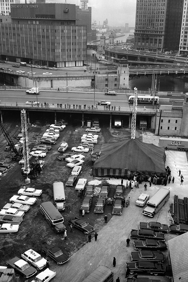 | Calm before the storm. This image was captured on November 21, 1960, the day before the groundbreaking ceremony, which will take place inside the tent. Case Foundation Company will continue with site preparation after the ceremony. This view looks west across the site, with the Chicago River at left and buildings along Dearborn Street in the distance. Photo by Bertrand Goldberg Associates. | ![]() |