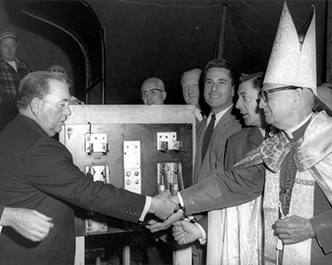 (Right) Photographers capture Archbishop Bernard J. Sheil about to throw the switch. Speaking to Sheil at left is Charles Swibel. On the other side of Sheil is William McFetridge and Mayor Daley. |