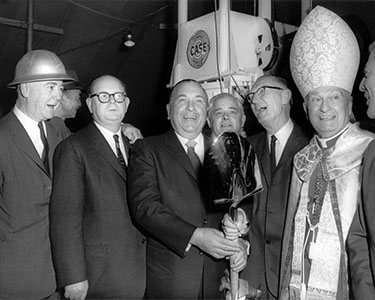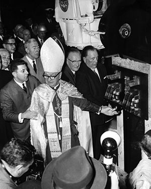 After the speeches, Archbishop Bernard J. Sheil pulled a switch that started an electric augur with a helical bit that officially broke ground at Marina City.