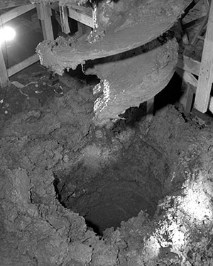 “I remember the groundbreaking vividly,” he says. “I remember they had this big drill, and someone pulled a lever, and the thing started turning the ground.” The drill, an auger for boring holes, was eight stories tall and poked through the top of the tent from a raised platform. (Right) The hole dug by an auger to break ground. The Art Institute of Chicago, Ryerson & Burnham Archives. |