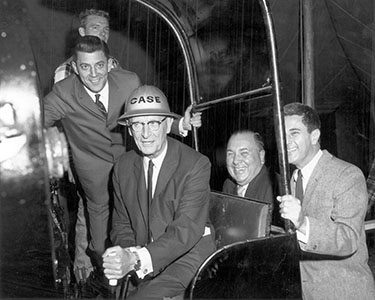In a lighter moment, real estate executive Charles Swibel, union president William McFetridge, Chicago Mayor Richard J. Daley, and architect Bertrand Goldberg pretend to operate construction equipment following the Marina City groundbreaking ceremony on November 22, 1960. |