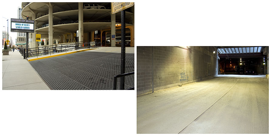 (Above left) Entrance ramp to Marina City complex from State Street. (Above right) Marina level under State Street. Grating in upper right is the State Street entrance to the private driveway above. Photographed in 2007.