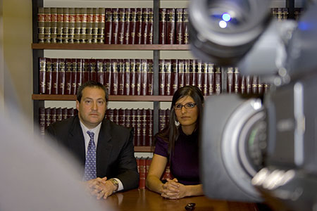 (Left) This time, local news cameras were photographing Brittney Hernandez – the woman seen in a smartphone video being assaulted by a House of Blues security officer – at a news conference on December 10, 2009. On the left is her attorney, Stuart Brody. |