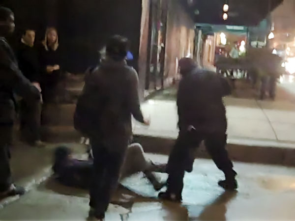 | (Right) In this enhanced frame from smartphone video, the man at right, Darrell Gibson, has just struck in the face Brittney Hernandez, who falls to the ground. The incident happened on the south side of Kinzie Street, in a private driveway that leads to the marina level of Marina City. In the background is Harry Caray’s Italian Steakhouse. Video by Tiffany Bryant. | ![]() |