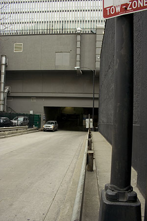 Brittney Hernandez, a 23-year-old lighting designer in Chicago, was at House of Blues for a concert by the pop rock band Hanson, best known for its 1997 hit song, “MMMBop.” After the show, Hernandez walked about half a block north to a driveway used by tour buses to get to House of Blues. She hoped to glimpse the band as their bus left Marina City and turned onto Kinzie Street. (Left) This driveway (photographed in November 2009) between the then-unfinished Museum of Broadcast Communications and Harry Caray’s Italian Steakhouse, leads to the marina level of Marina City and House of Blues, where tour buses load and unload. |