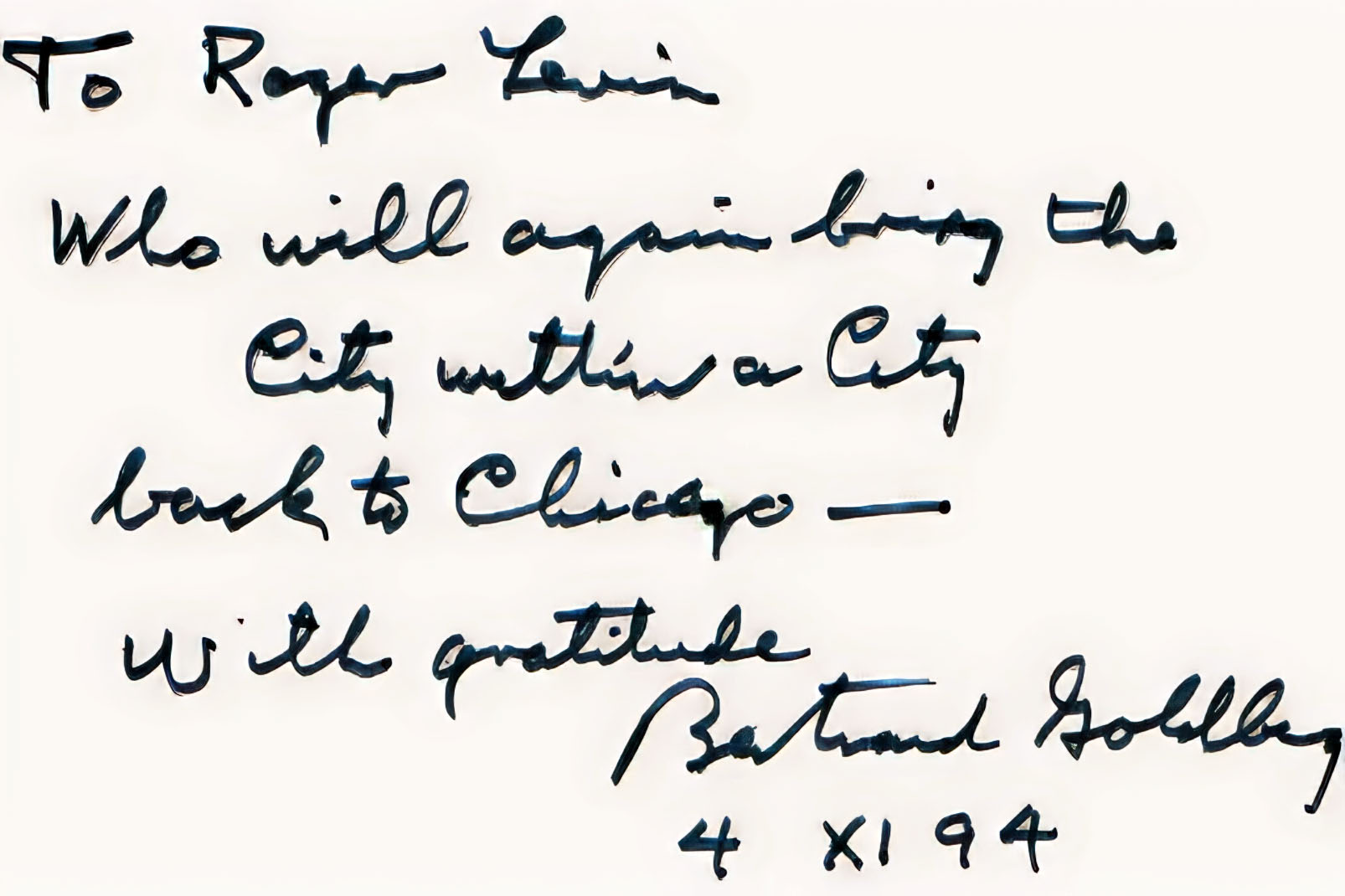(Left) A handwritten note from Marina City architect Bertrand Goldberg to developer Roger Levin dated November 4, 1994 (Goldberg is using a Roman numeral for the month, a style popular in Europe). “To Roger Levin, who will again bring the City within a City back to Chicago – With gratitude, Bertrand Goldberg.” |