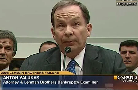 | (Right) In 2009, Anton R. Valukas was appointed examiner in the bankruptcy of Lehman Brothers. He is seen here on C-SPAN testifying at a House Financial Services Committee hearing on April 20, 2010. | ![]() |