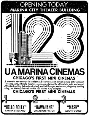 Marina Cinemas was a triplex movie theater at Marina City in the 1970s. Owned by United Artists, it opened on September 25, 1970, with “The Hawaiians,” “Hello, Dolly!” and “M*A*S*H.” It closed in 1977 with “Rocky” and “Young Frankenstein.”