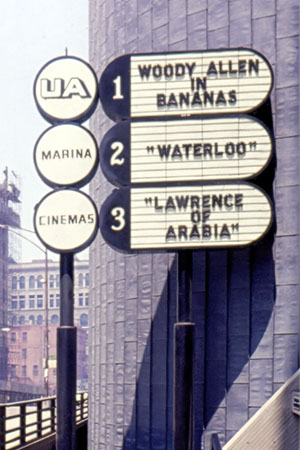 According to a 1970 newspaper ad, UA Marina Cinemas were Chicago’s first mini-cinemas. “A dramatic new concept in comfort and convenience in motion picture entertainment. Three separate, intimate theaters – each one offering the ultimate in sight and sound. Attendant parking (at reduced rates), cocktail lounges, restaurants, shopping, bowling alley, ice skating rink – all within the Marina City complex.” (Left) Signs on Dearborn Street outside Marina Cinemas in 1971. Photo by John P. Keating Jr. |