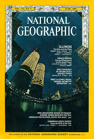 For its June 1967 issue, National Geographic put Marina City on the cover. Seen through a fisheye lens, the view of the Chicago River from east of the Dearborn Street Bridge also appeared on a two-page spread – part of a 53-page article on Illinois. “World’s loftiest apartments,” declared the magazine. “588-foot towers of Marina City blaze with Christmas lighting. The darkened lower 20 floors house parking spaces, restaurants, a supermarket, and a basement marina on the Chicago River. Above these, pie-slice apartments soar another 40 stories.” (Left) Photo by Bruce Dale |
