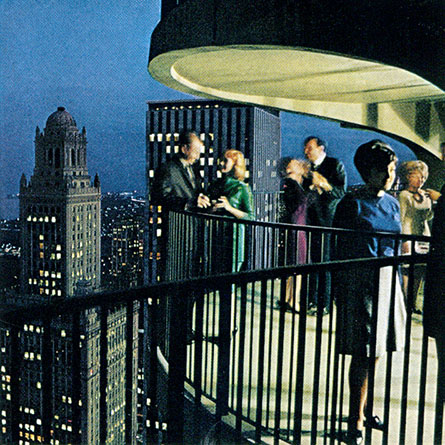 “With the city for footlights, sky dancers twirl 52 stories high at Marina City. At this height, traffic tumult fades to silence and the view ranges into Indiana.” (Right) Photo by James L. Stanfield |