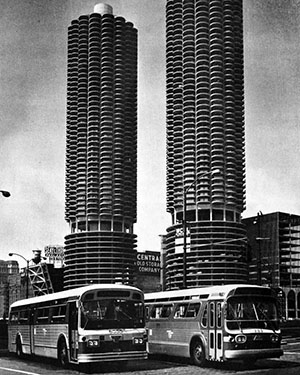 Two Chicago Transit Authority buses are parked on Wacker Drive for this photo from, most likely, 1963. In the background, both the west tower (left) and east tower (right) of Marina City appear to be open, so it is at least 1963, but the office building at far right is still being constructed and it will not start to open until February 25, 1964. The bus on the left is newer than the bus on the right. It is an 8500-series bus built by an Ohio company called Flxible that closed in 1996. CTA photographed this new model of bus in front of Marina City and on State Street with the Chicago Sun-Times and Wrigley Building in the background. |