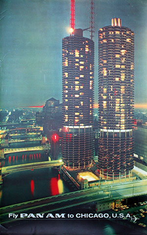 (Near left) 1965 poster promoting Pan Am and featuring Marina City at night. |