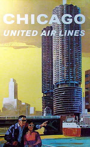 (Far left) Circa 1963 poster for United Air Lines, painted by Thomas Hoyne, depicting Marina City from the Chicago River east of the State Street Bridge.