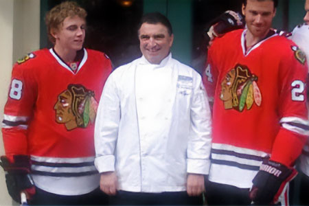 | (Right) Executive Chef Hans Aeschbacher poses with Chicago Blackhawks hockey players outside Smith & Wollensky in February 2011. Photo obtained from Chef Hans Aeschbacher’s Facebook page. | ![]() |